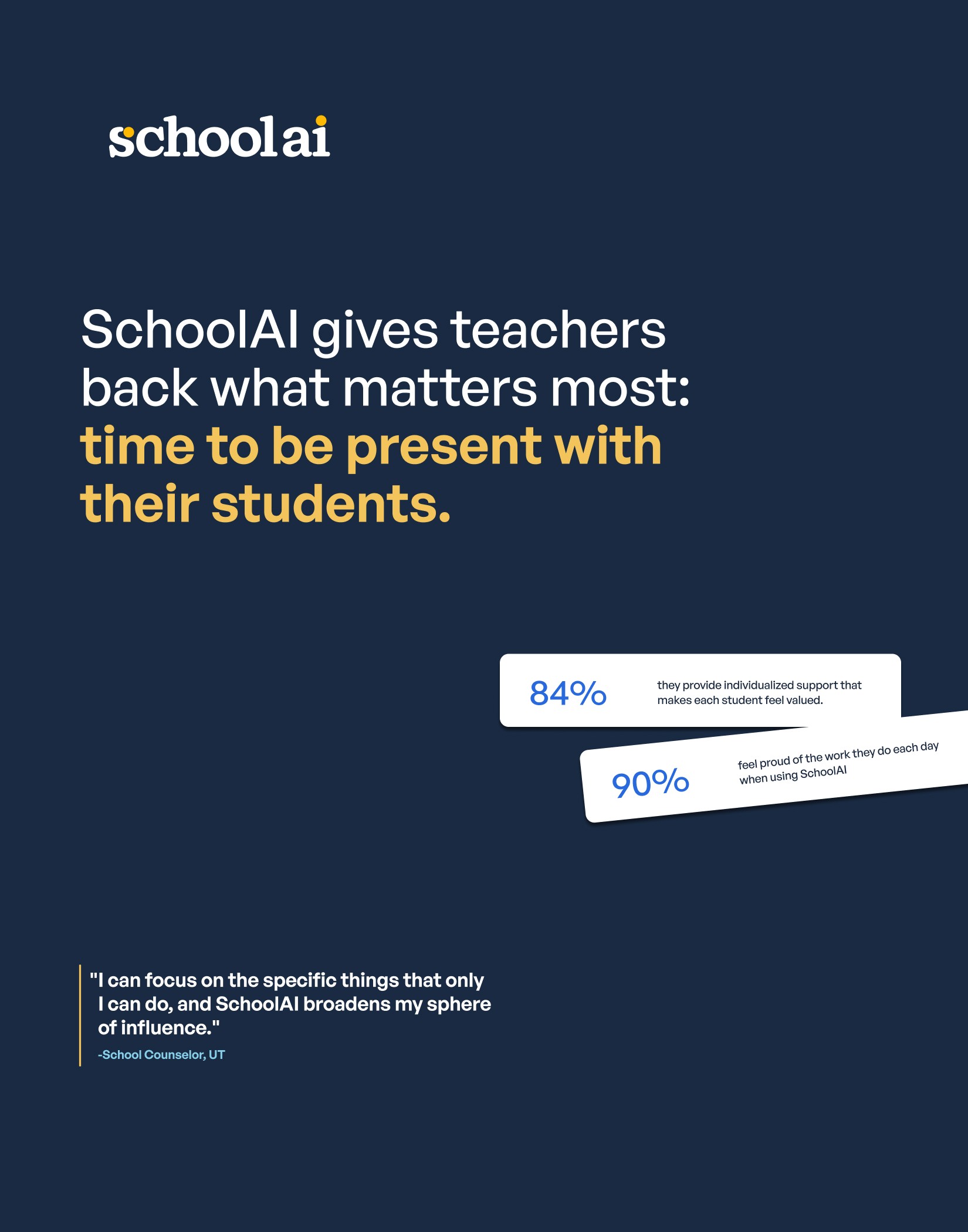 As one Utah school counselor put it, "I can focus on the specific things that only I can do, and SchoolAI broadens my sphere of influence."
