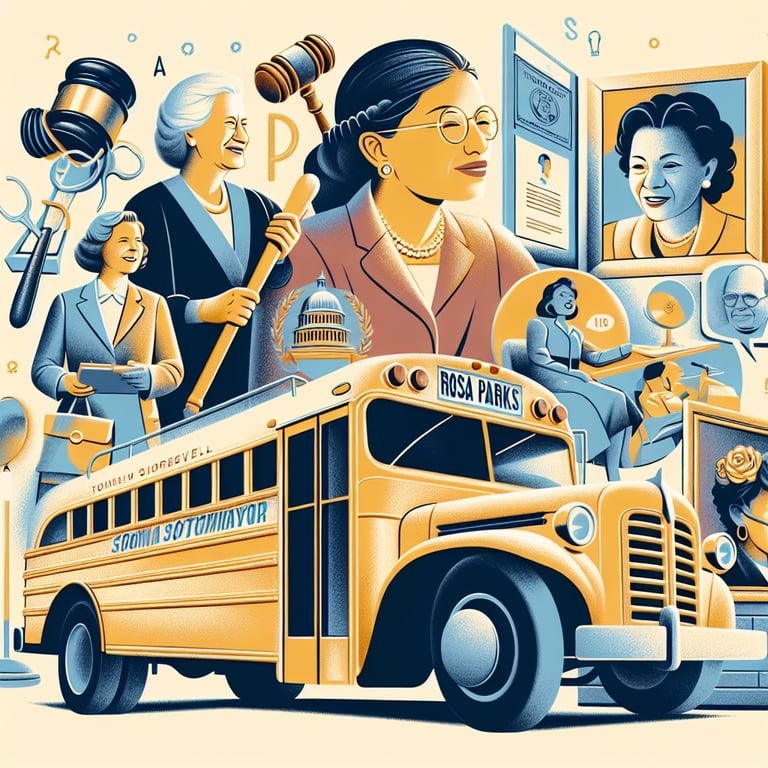 Explore the significant contributions of three influential women—Rosa Parks, Eleanor Roosevelt, and Sonia Sotomayor—who shaped American history and society. This learning space focuses on their lives, their defining moments, and their lasting impact on civil rights, social reform, and the judiciary. Engage with the narratives of these powerful women to understand their roles in advancing equality and justice in the United States.